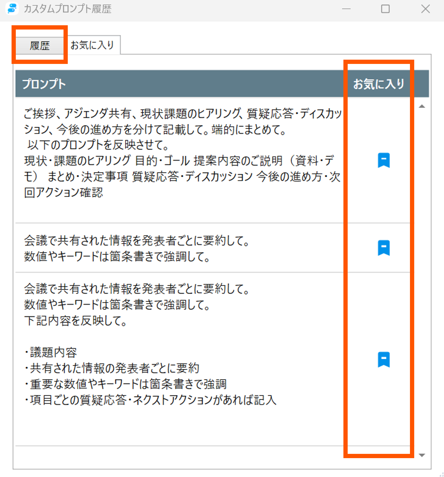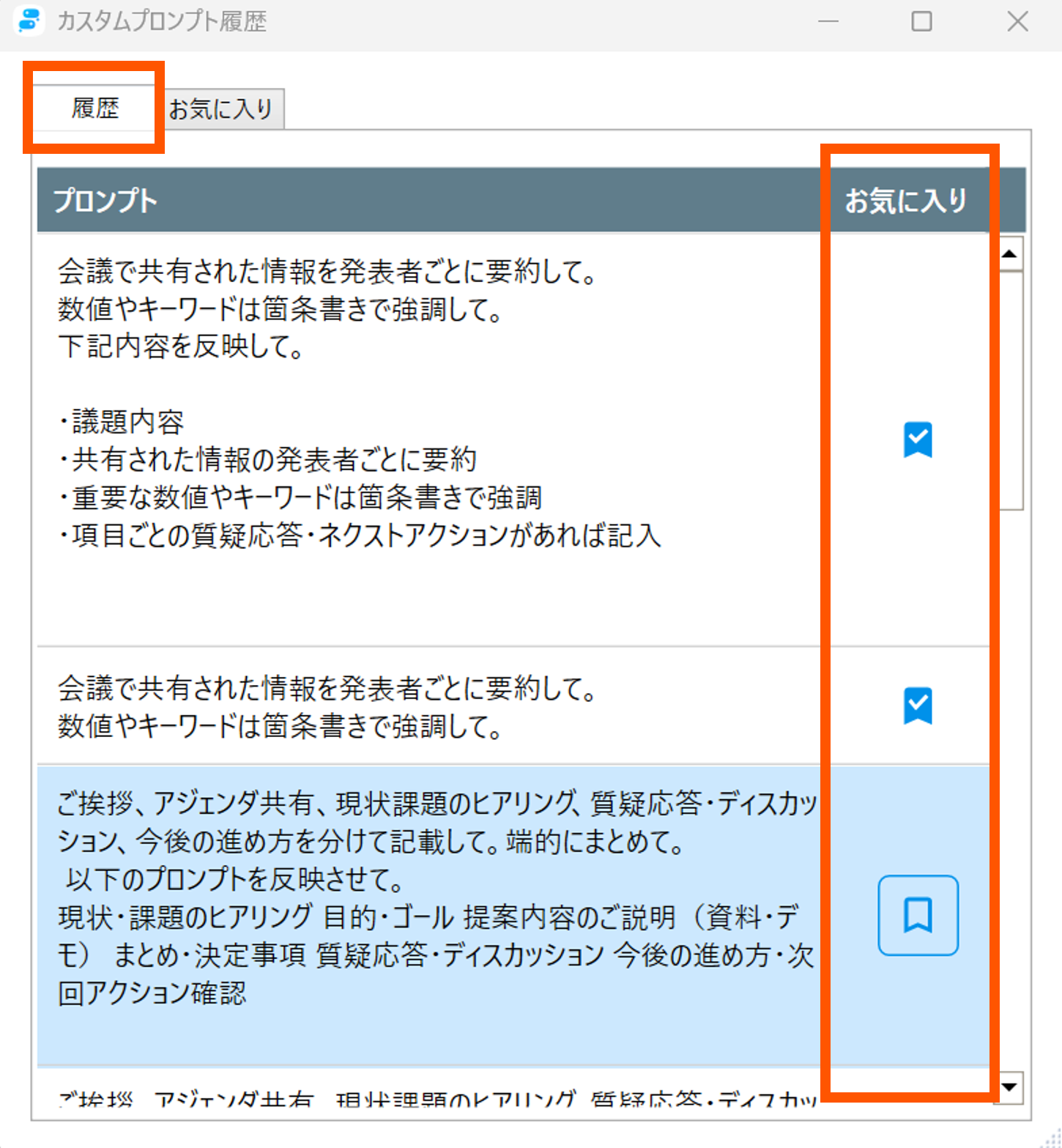 スタンドアローン要約で過去に実行したプロンプトの履歴を最新10件まで確認することができます。