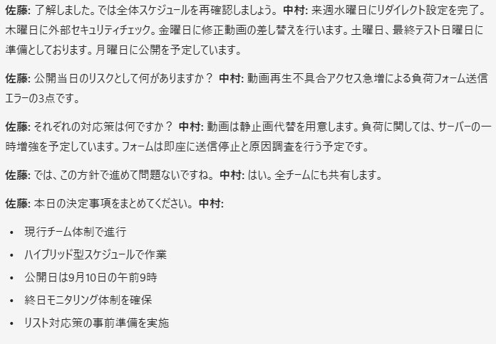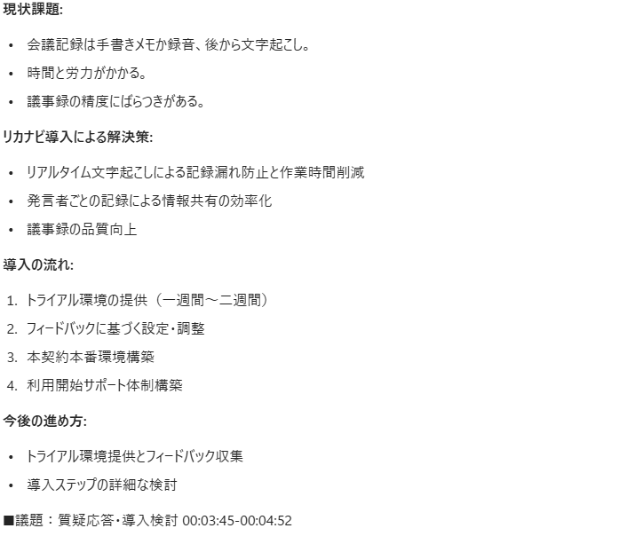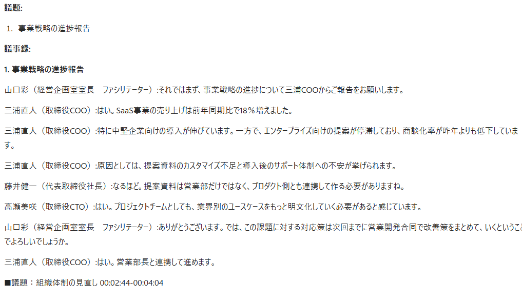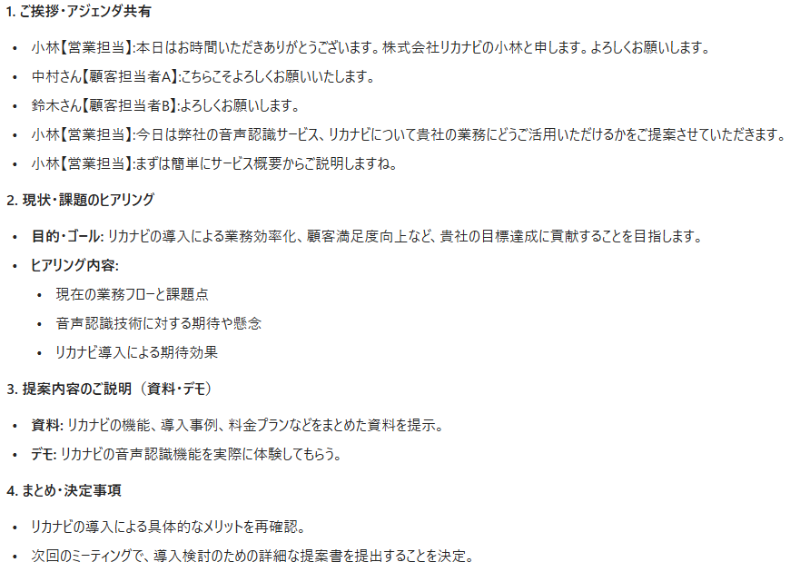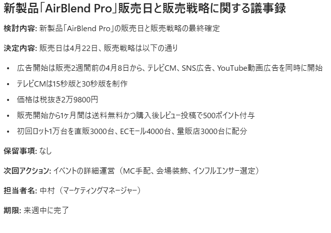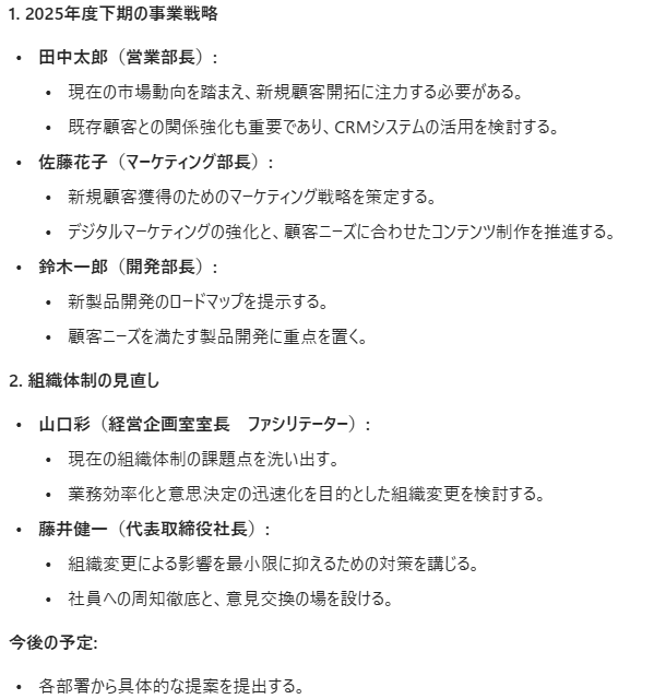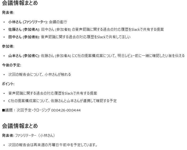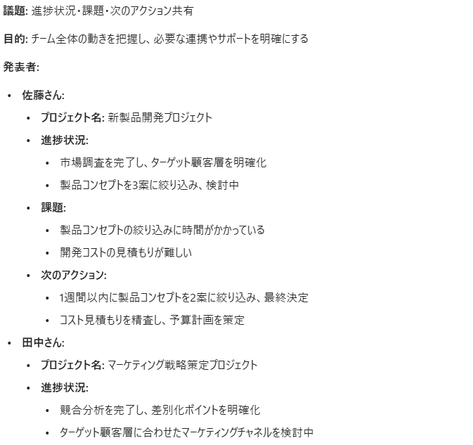 会議で共有された情報を発表者ごとに要約して。 数値やキーワードは箇条書きで強調して。 | 会議で共有された情報を発表者ごとに要約して。 数値やキーワードは箇条書きで強調して。 下記内容を反映して。 ・議題内容 ・共有された情報の発表者ごとに要約 ・重要な数値やキーワードは箇条書きで強調 ・項目ごとの質疑応答・ネクストアクションがあれば記入 |