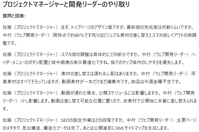 会議の議事録を作成して。 条件は次のとおり: すべての議題について書くこと。 要約せず、発言の内容をそのまま残すこと。 不要な話や雑談は書かないこと。 口語を文語に直し、長い言い方は短くすること。 発言者ごとに段落を分けること。 ビジネス文書として読みやすく整えること。 | 以下の条件で、ビジネス用の逐語議事録を作成して。 ・すべての議題に対して作成すること。 ・要約は行わず、発言の内容は原文に忠実に記載すること。 ・明らかに不要な発言や雑談は省略して構わない。 ・口語表現は文語表現に直し、冗長な言い回しは簡潔に修正すること。 ・発言者ごとに段落を分けること。 ・ビジネス文書として読みやすく整えること。 |