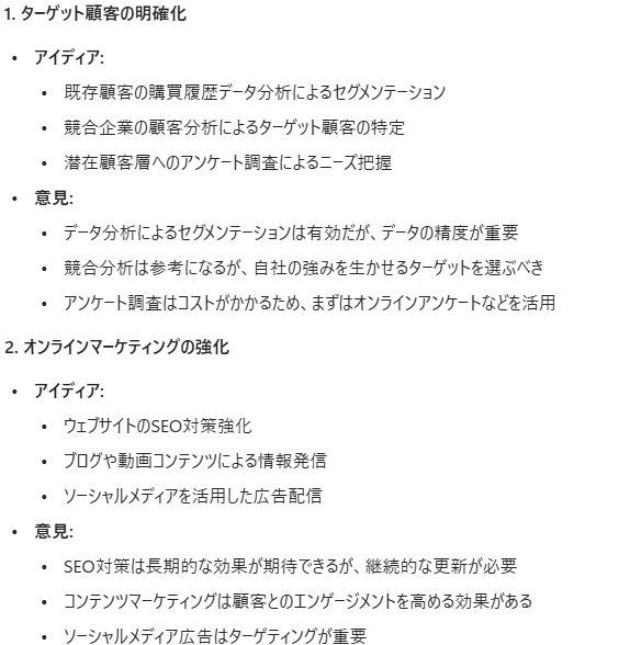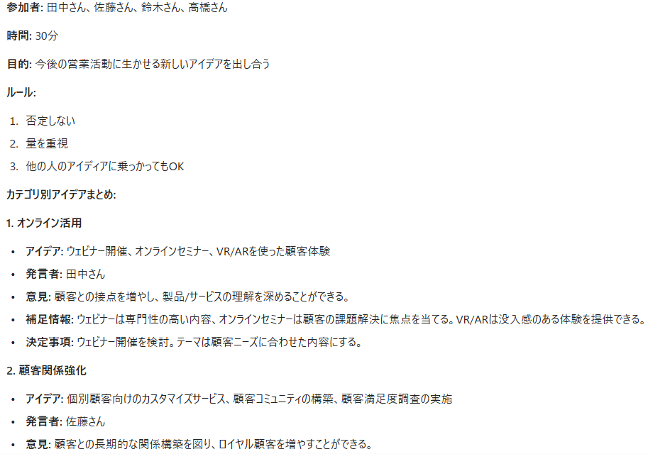 この会議のアイディアと意見ごとにセットで記載して。 また項目ごとに改行して。 | 会議で出たアイディアを、カテゴリ別に整理して要約して。各アイディアの発言者、主な意見(賛成・反対)、補足情報を含めて。 話口調ではなく端的にまとめて。 以下のプロンプトを反映して カテゴリ別に整理 各アイディアのメリット・デメリット、発言者、主な意見(賛成・反対)、補足情報、決定事項 |
