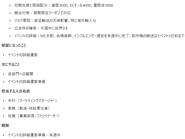 会議の話を全部まとめて議事録を作成して。 まとめ方はこの順番にして: 検討内容(議題を簡潔に) 決まったこと 保留になったこと 次にやること 担当する人の名前 期限 | 全ての発言を網羅し、各議題に対してビジネス要約議事録を作成して。 その際、以下の条件をすべて満たすこと。 以下の順序でまとめること:検討内容/決定内容(決定理由を簡潔に)/保留事項/次回アクション(具体的に)/担当者名/期限(あれば) 原文にない推測は一切記載禁止。明確でない場合は「不明」とする 各項目は1行以内で簡潔に記載する。 文体は簡潔な文語体とし、冗長や曖昧な表現は使用しない。 期限は原文から抜き出して記載 |