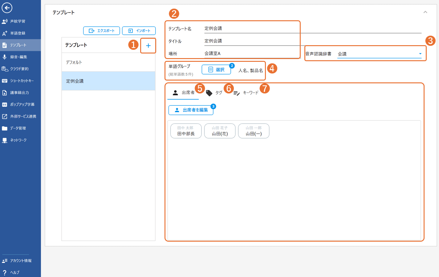 テンプレートとは、録音前設定および音声ファイル認識前設定の